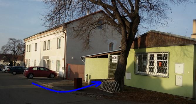 Po necelých 100 m uvidíte po levé straně světle zelenou budovu (bývalé uhelné sklady) označenou OČNÍ ORDINACE.